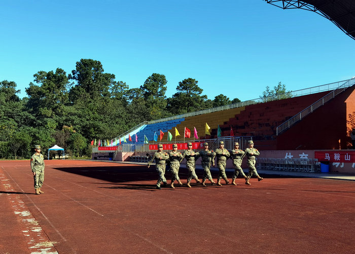 随后,承训教官代表郭飞发言,承诺将以坚定的政治思想和过硬的军事素质为学生们树立榜样,确保本次军训任务高标准、高质量完成。最后,承训教官团队进行了精彩的队列展示,他们整齐的步伐、铿锵有力的口号,展现出扎实的基本功,博得了同学们阵阵喝彩。