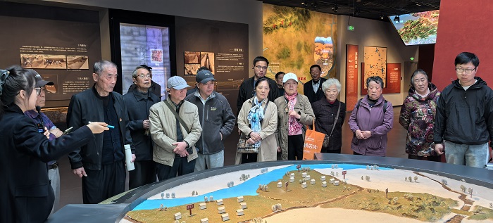 在凌家滩博物馆内,老同志们跟随着讲解员的步伐,认真听取凌家滩遗址发掘情况和凌家滩文化概况的详细讲解,实地参观凌家滩文明探源馆、历次发掘遗址和大型红烧土遗迹发掘现场等。他们细致观看了馆内陈列的精美玉器、古朴陶器以及丰富的考古发掘成果,通过一件件珍贵的文物与详实的史料,深切感受了凌家滩先民的非凡智慧与灿烂史前文明。这片土地所承载的深厚历史积淀与独特文化魅力,让老同志们赞叹不已,仿佛进行了一场与古老文明的深度对话。随后,老同志们来到了运漕古镇,沉浸式感受了千年古镇的历史韵味和文化传承。