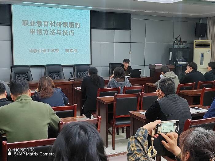 为切实提升教师科研素养与课题申报实操能力,11 月 7 日,马鞍山理工学校开展 “职业教育科研课题的申报方法与技巧” 专题校本培训,马鞍山市中职思政名师工作室主持人胡常海老师应邀主讲。