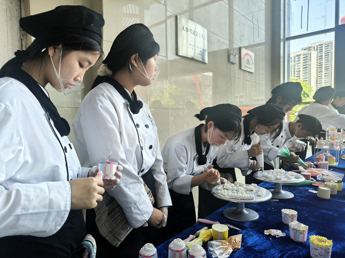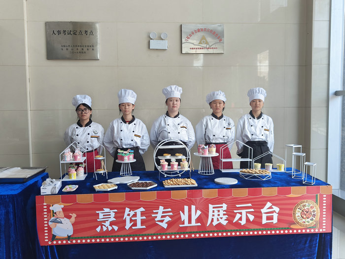 活动现场人头攒动,师生们齐聚学校广场,各专业部纷纷摆台展示才艺,通过实物展示、现场操作、模拟演练等形式,全面展示了学校各专业部的教学成果和学生的实践实操能力。汽修专业部教师及学生现场演示了新能源汽车电池包的构造、应用原理,汽车营销专业学生现场介绍比亚迪等新能源汽车的性能、车型配置等;计算机专业部学生展示了综合布线安装维护;经贸部烹饪专业学生现场制作烘焙蛋糕、饼干、蛋挞等精美糕点,引得参加活动的领导、师生驻足品尝,大家对学生的精细手艺赞不绝口。