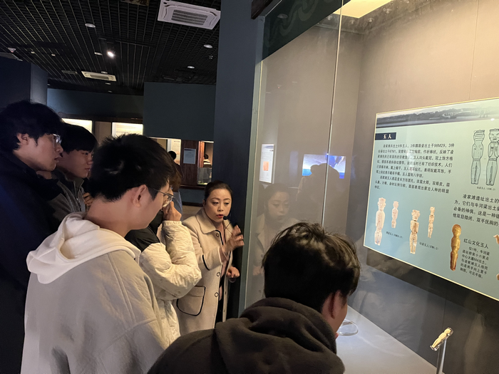 含山博物馆作为承载地方文明的重要载体,馆藏文物涵盖新石器时代至明清时期,尤以凌家滩遗址出土的玉器、陶器为核心亮点,集中展现了长江下游地区史前文明的辉煌成就。活动伊始,在博物馆讲解员的引导下,同学们有序参观了“文明曙光—凌家滩文化展”“古韵含山—历史文化展”等核心展厅。从造型精巧的玉钺、玉璧到纹饰古朴的陶鼎、陶罐,从记录农耕文明的生产工具到反映先民生活的生活用品,每一件文物都成为跨越时空的“历史坐标”。讲解员结合文物背后的考古故事与工艺传承,详细解读了史前先民的匠心智慧——凌家滩玉器的精准切割、陶器的轮制技艺,无不体现着古人对工艺精度的极致追求,这与汽车专业所倡导的“精益求精、追求卓越”的职业精神不谋而合。