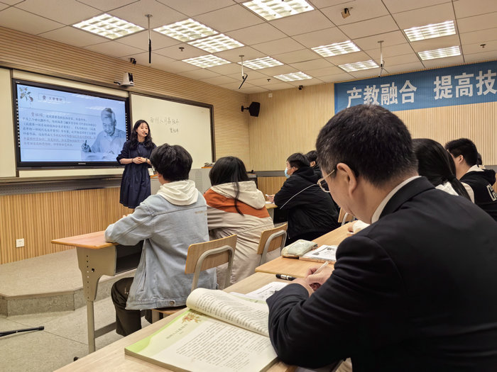 在评课环节,朱玲老师对教学活动进行了自评和反思,语文研究室徐鸣、吴海红、陈燕三位老师分别从教学设计思路、突出新课标理念、学习目标达成、教学手段创新、促进与专业融合等方面作了点评,分享了自己在听课中受到的启发。余祖良老师对该课时教学给予充分肯定,并以“从‘红专’教材到‘红专’人才”为主题,从跨专业教学、教学评一体化和如何做到“适学”三个方面对语文教学作了深入阐述。