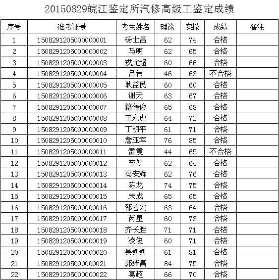现将2015年8月皖江职教中心鉴定所社会化汽车维修工(高级)鉴定成绩公示如下: