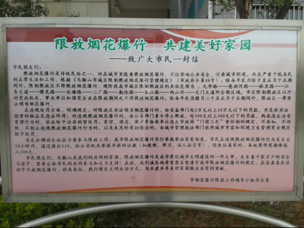 为了认真落实《马鞍山市城区限制燃放烟花爆竹管理规定》(市政府令第46号),切实减少因燃放烟花爆竹所带来的噪音扰民、环境污染、安全隐患等问题,学校根据市教育局马教秘[2015]188号文件精神,在校内进行一系列相关宣传教育活动,也取得了良好的效果。现将活动情况总结如下: